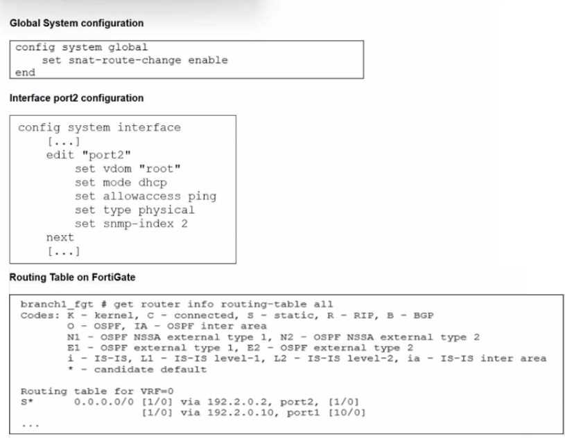 The exhibits show the source NAT (SNAT) global setting. port2 interface settings, and the routing