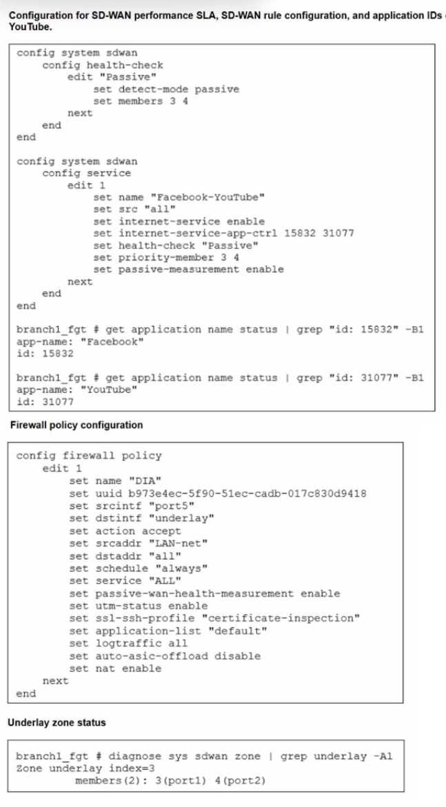 The exhibits show the configuration for SD-WAN performance. SD-WAN rule, the application IDs of