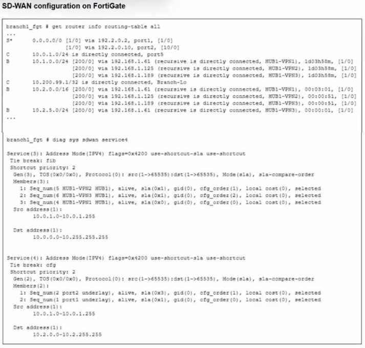 10.0.1.0/24 to the server 10.2.5.254 is matched by SD-WAN rule 3 and sent out via the HUB1-VPN3
