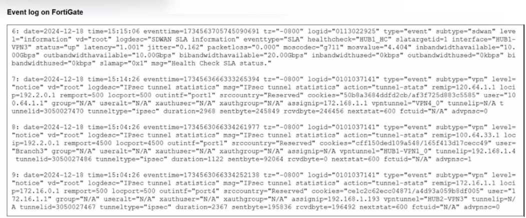 Event logs (from the exhibit) show how traffic is matched to SD-WAN rules and routed. The log