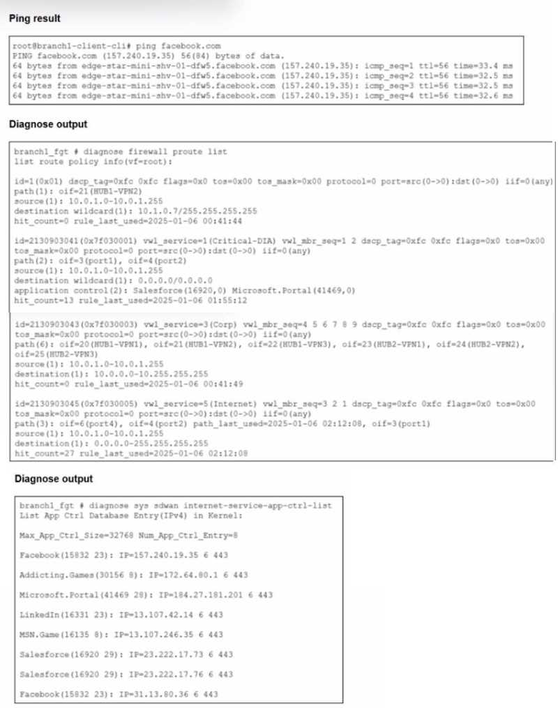 Based on the exhibits, which interface uses branch 1_fgt to steer the test traffic?