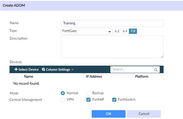 The Security Fabric license, group name, and password are required for the FortiManager Security Fabric integration.