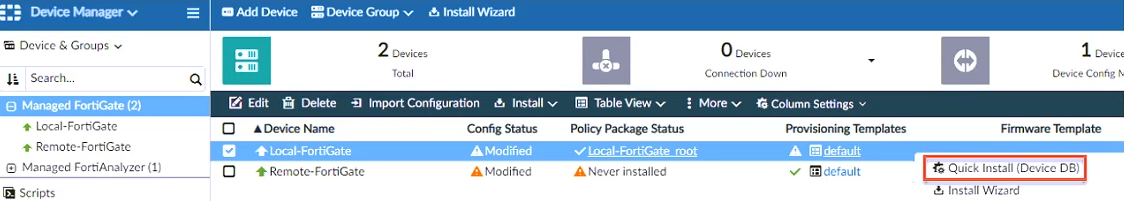 Refer to the exhibit. You are using the Quick Install option to install configuration changes on the managed FortiGate. Which two statements correctly describe the result? (Choose two.)