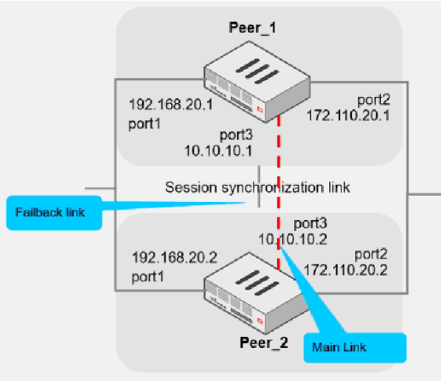 The main link directly connects the two FortiGate devices and is configured using the set session-syn-dev <interface> command.