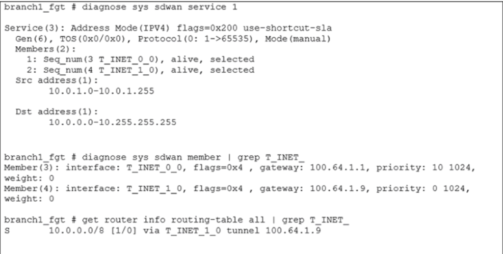 Refer to the exhibit. An administrator is troubleshooting SD-WAN on FortiGate. A device behind branch1_fgt generates traffic to the 10.0.0.0/8 network. The administrator expects the traffic to match SD-WAN rule ID 1 and be routed over T_INET_0_0. However, the traffic is routed over T_INET_1_0. Based on the output shown in the exhibit, which two reasons can cause the observed behavior? (Choose two.)