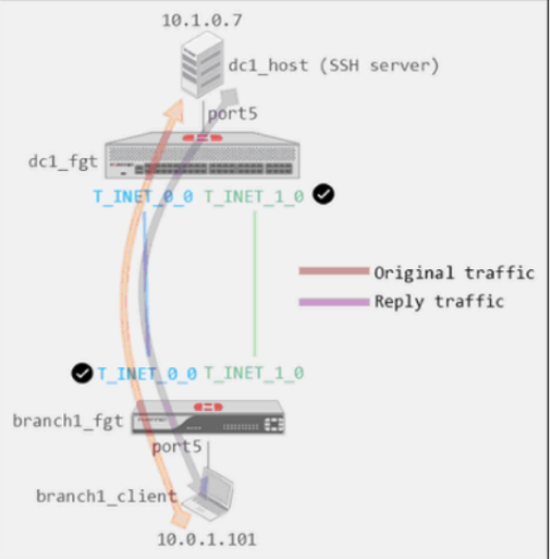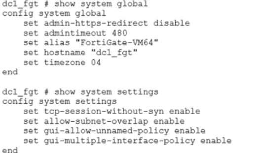 Exhibit B Exhibit A shows a site-to-site topology between two FortiGate devices: branch1_fgt and dc1_fgt. Exhibit B shows the system global and system settings configuration on dc1_fgt. When branch1_client establishes a connection to dc1_host, the administrator observes that, on dc1_fgt, the reply traffic is routed over T_INET_0_0, even though T_INET_1_0 is the preferred member in the matching SD-WAN rule. Based on the information shown in the exhibits, what configuration change must be made on dc1_fgt so dc1_fgt routes the reply traffic over T_INET_1_0?