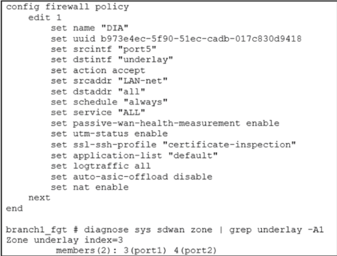 Exhibit B Exhibit A shows the SD-WAN performance SLA configuration, the SD-WAN rule configuration, and the application IDs of Facebook and YouTube. Exhibit B shows the firewall policy configuration and the underlay zone status. Based on the exhibits, which two statements are correct about the health and performance of port1 and port2? (Choose two.)