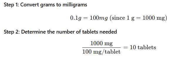 A prescriber orders1000 mgof a medication. If the stock bottle label stateseach tablet contains 0.1 g,
