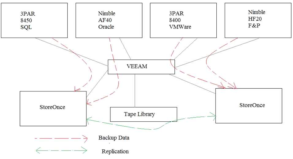 backups via Veeam backup to an HPE StoreOnce device. These backups are then replicated to an
