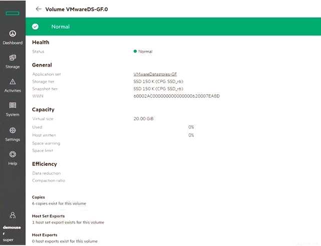 You are configuring a new HPE array and verifying properties of a set of volumes.