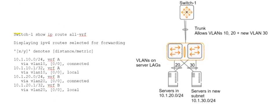 added a Layer 3 VLAN 30 interface attached to this VRF on Switch-1. You want to make the services in