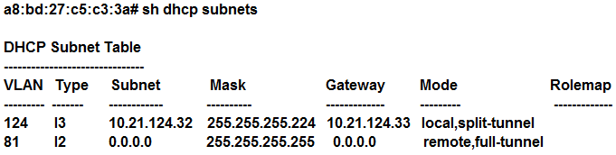 Based on the output shown in the exhibit, which IAP-VPN DHCP modes are being used?