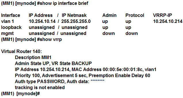 administrator verifies that VRRP is running, and prepares to complete the setup with the following
