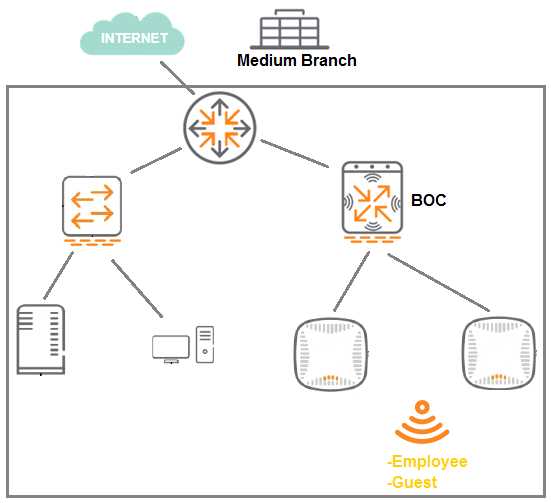 A 7008 Branch Office Controller (BOC) is deployed in a remote office behind a core router. This core