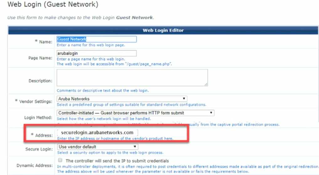 Configure the vendor settings in the Network Access Device (NAD) to match the web login page.