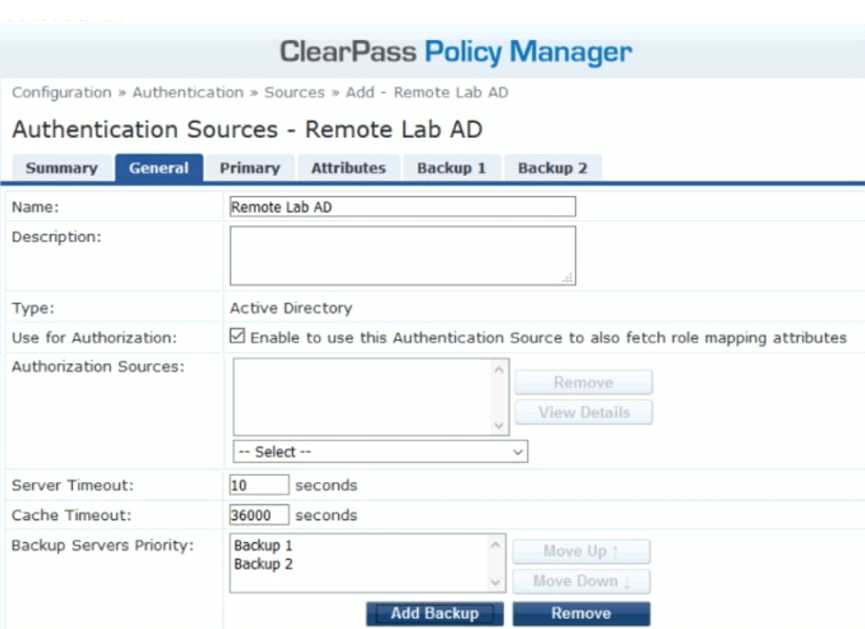ClearPass receives a timeout attempt when trying the Remote Lab AD server first. It will then try the server Backup 1 and Backup 2; both will send a result authentication failed.