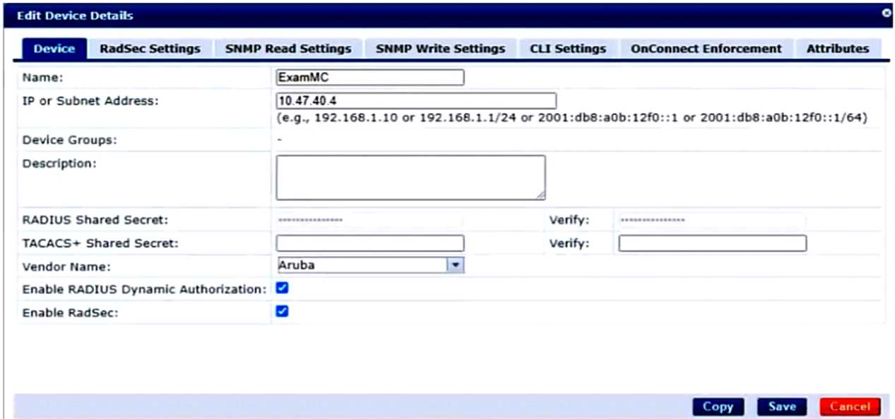 shows ClearPass Policy Manager's (CPPM's) settings for an Aruba Mobility Controller (MC).
