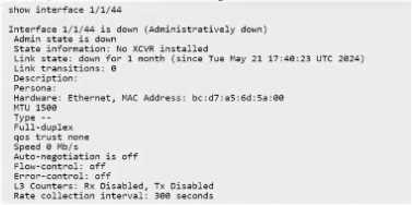 A new port 1/1/44 needs to be configured to connect to a 29301, which has the following