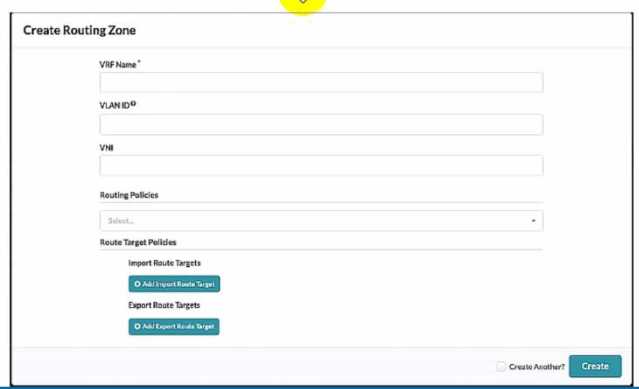 To create a new routing zone, you must specify the VRF Name, VLAN ID, and VNI for the routing zone.