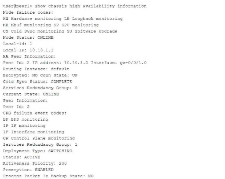 The exhibit describes a Chassis Cluster configuration with high availability (HA) settings. The key