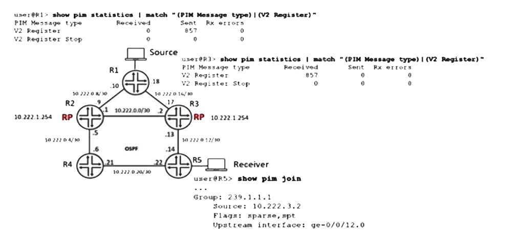 Referring to the exhibit, anycast RP is implemented to ensure multicast service availability. The