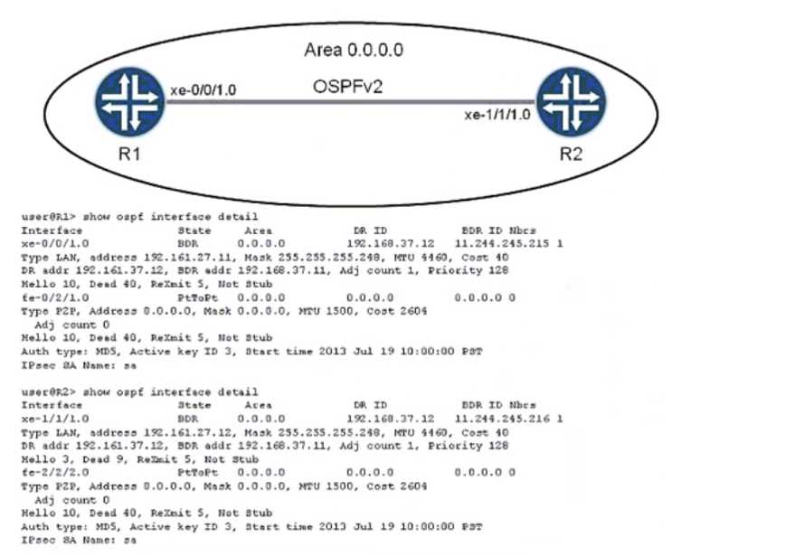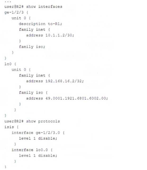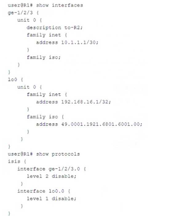 Referring to the exhibit, what must be changed to establish a Level 1 adjacency between routers R1