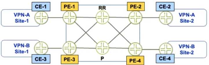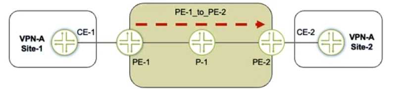 Traffic is sent from VPN-A Site-1 → CE-1 → PE-1 → P-1 → PE-2 → CE-2.
