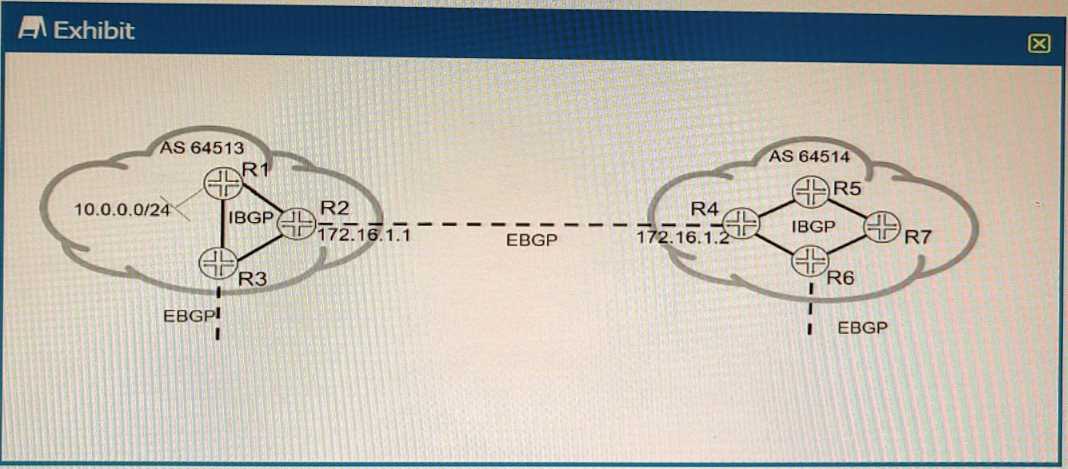 Referring to the exhibit; the 10.0.0.0/24 EBGP route is received on R5; however, the route is being