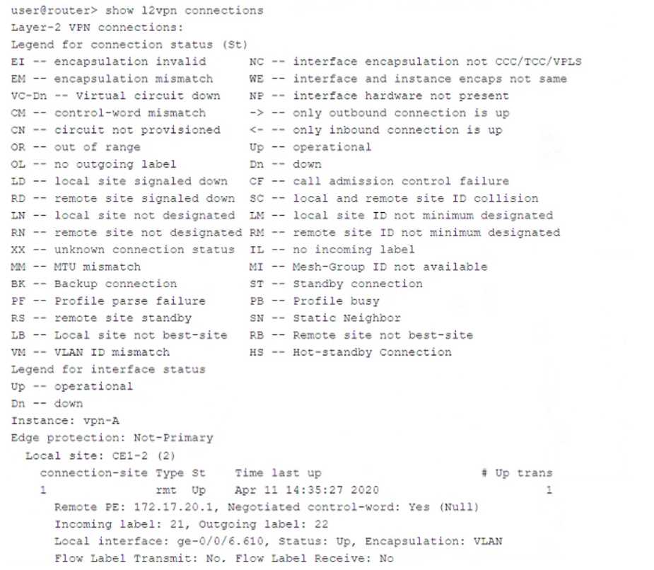 The output is from the show l2vpn connections command on a Juniper router. This command is used