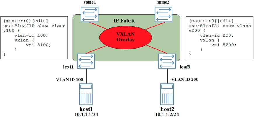 The VNI assigned to the host1 link must be the same as the VNI assigned to the host2 link.