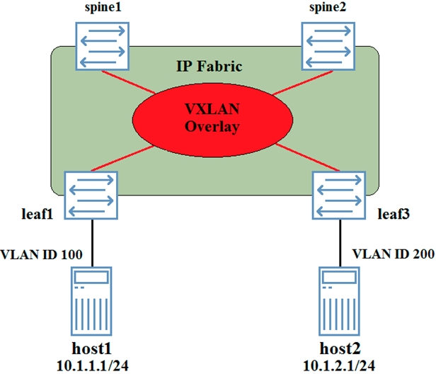 Traffic from host1 to host2 will transit the VXLAN tunnel from leaf1 to leaf3.