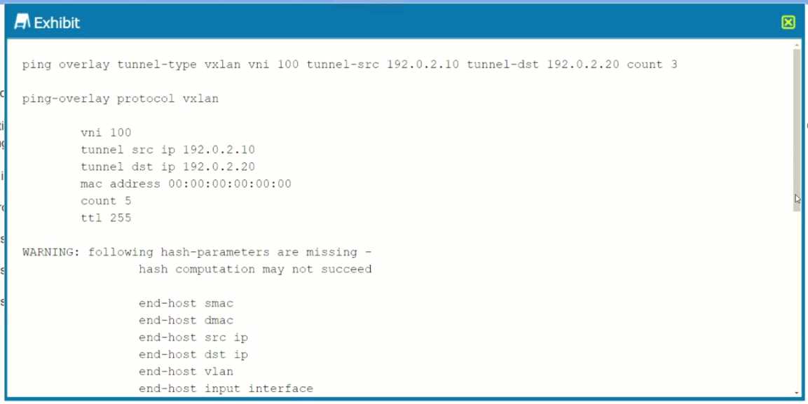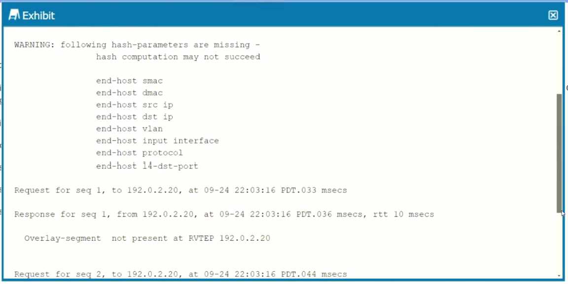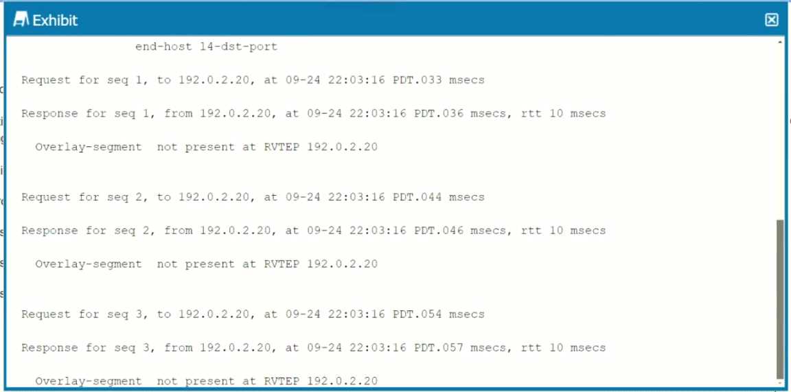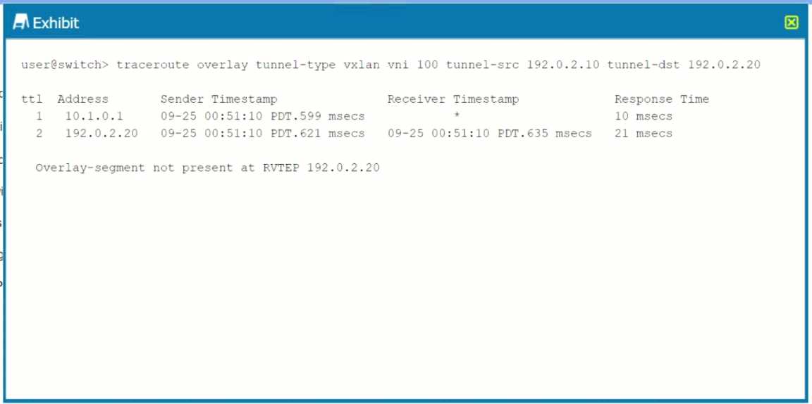Exhibit. You are troubleshooting a connectivity issue across a VXLAN overlay network. In the exhibit, you are using the ping overlay command from a local VTEP residing on a OFX 5120 to a remote VTEP residing on a separate QFX5120. What is the problem in this situation?