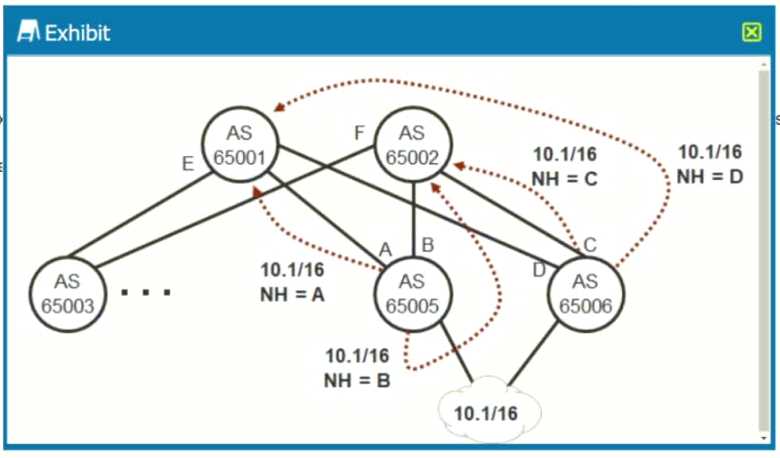 Exhibit. You choose the EBGP design shown in the exhibit as your IP fabric design. You must ensure that both routes received by the spine nodes will be used for ECMP forwarding Which BGP parameter would need to be added to the EBGP configuration of the spine nodes to achieve this goal?