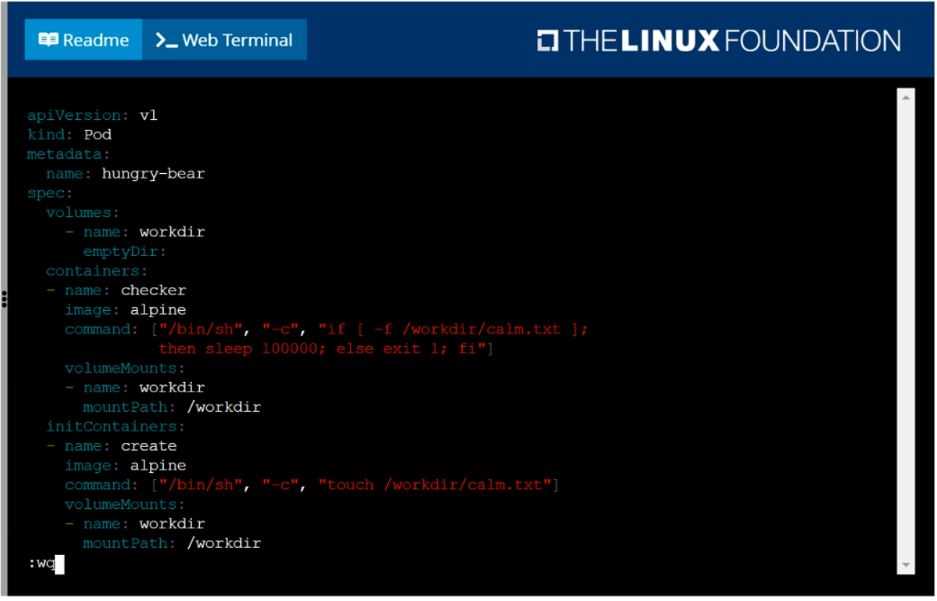 Add an init container to hungry-bear (which has been defined in spec file /opt/KUCC00108/pod-spec-