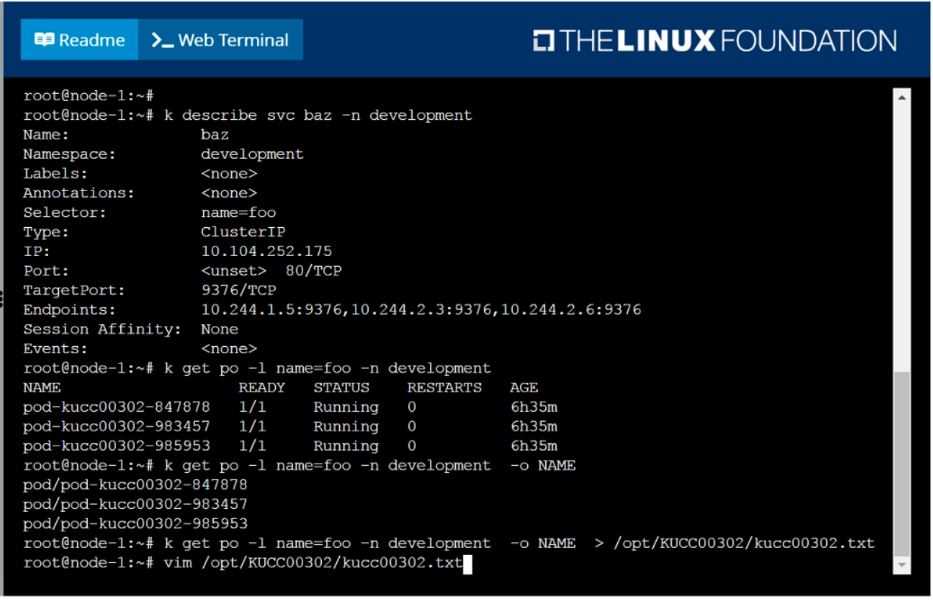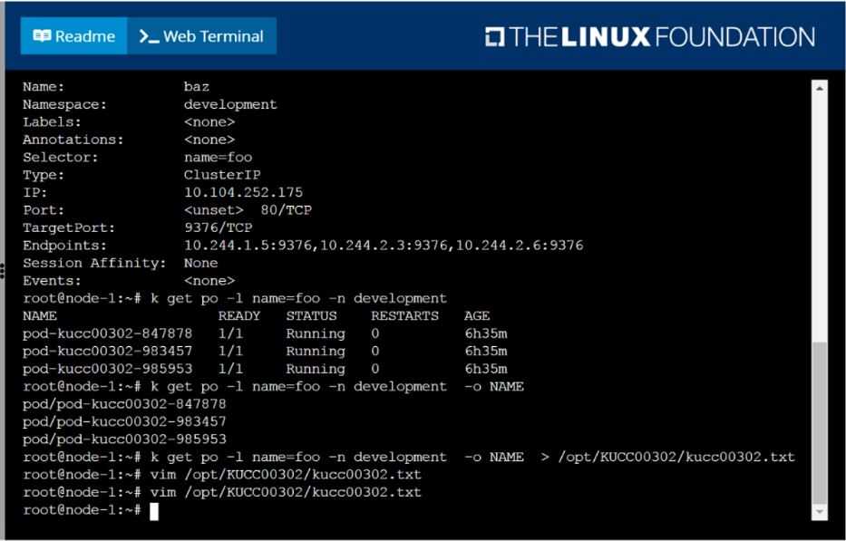 /opt/KUCC00302/kucc00302.txt that lists all pods that implement service baz in namespace