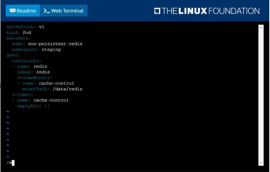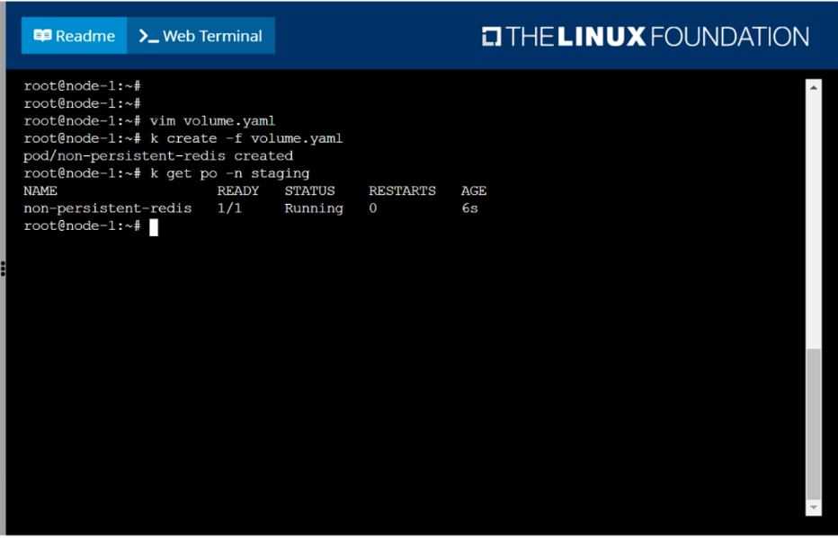 The pod should launch in the staging namespace and the volume must not be persistent.