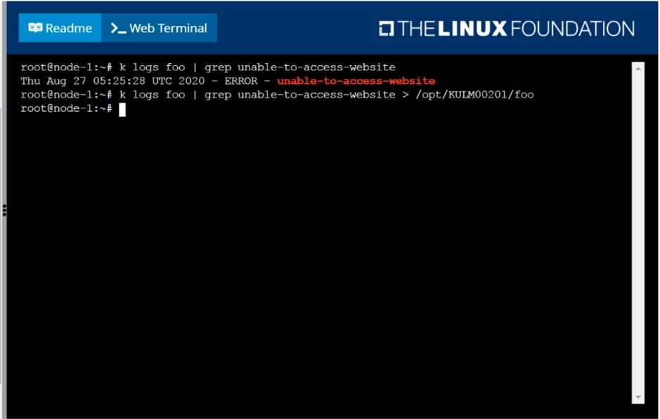 kubectl logs foo | grep "unable-to-access-website" > /opt/KULM00201/foo