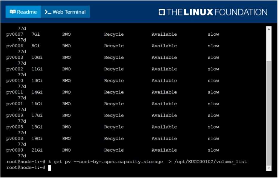 /opt/KUCC00102/volume_list. Use kubectl 's own functionality for sorting the output, and do not