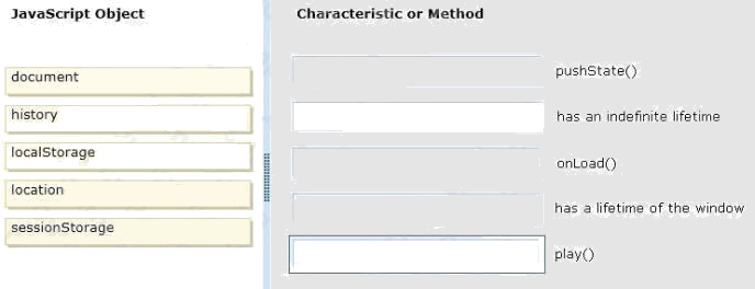 Match the JavaScript objects to the corresponding characteristics or methods. (To answer, drag the appropriate JavaScript