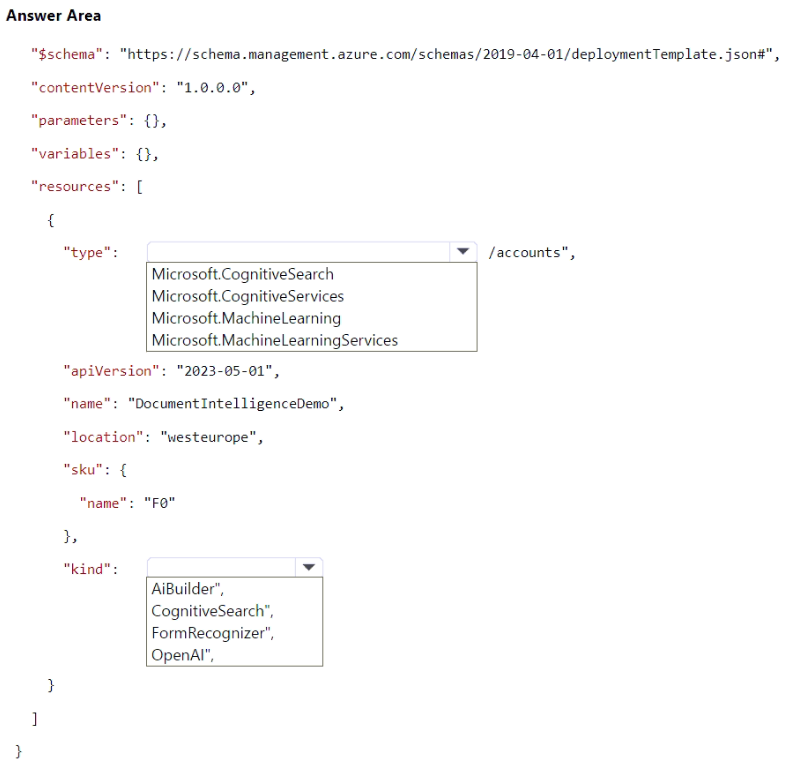 How should you complete the Azure Resource Manager (ARM) template? To answer, select the appropriate options in the answer area.