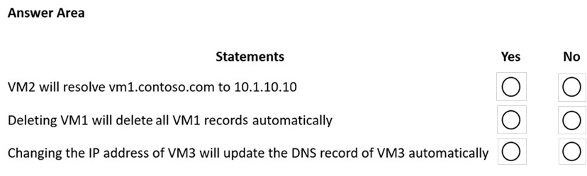 HOTSPOT You have an Azure private DNS zone named contoso.com that is linked to the virtual networks shown in the following table.