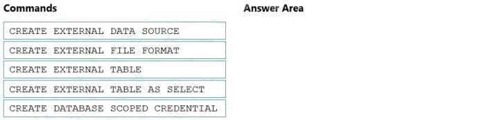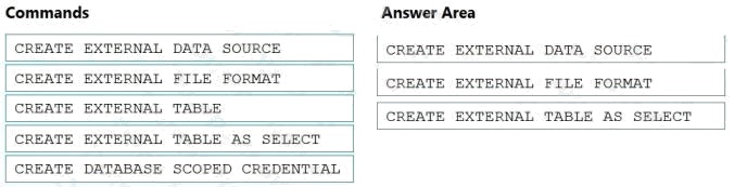 Which three Transact-SQL DDL commands should you run in sequence? To answer, move the appropriate commands from