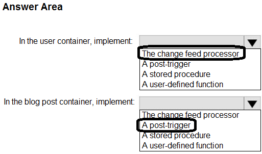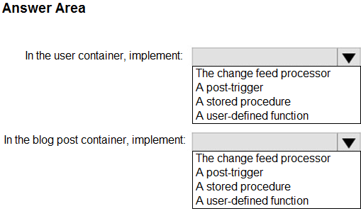 You plan to create an Azure Cosmos DB database named db1 that will contain two containers. One of the containers will contain blog posts, and the other will contain users. Each item in the blog post container will include: