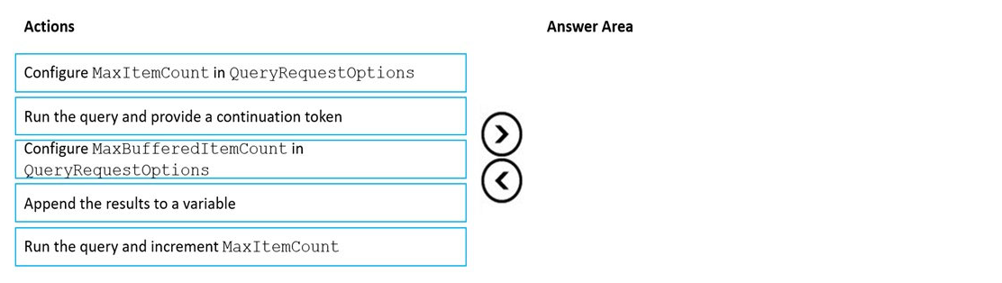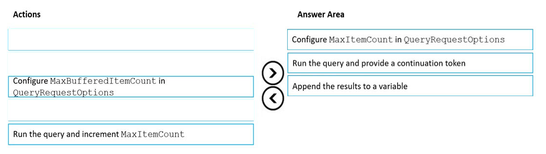DRAG DROP You have an app that stores data in an Azure Cosmos DB Core (SQL) API account The app performs queries that return large result sets.