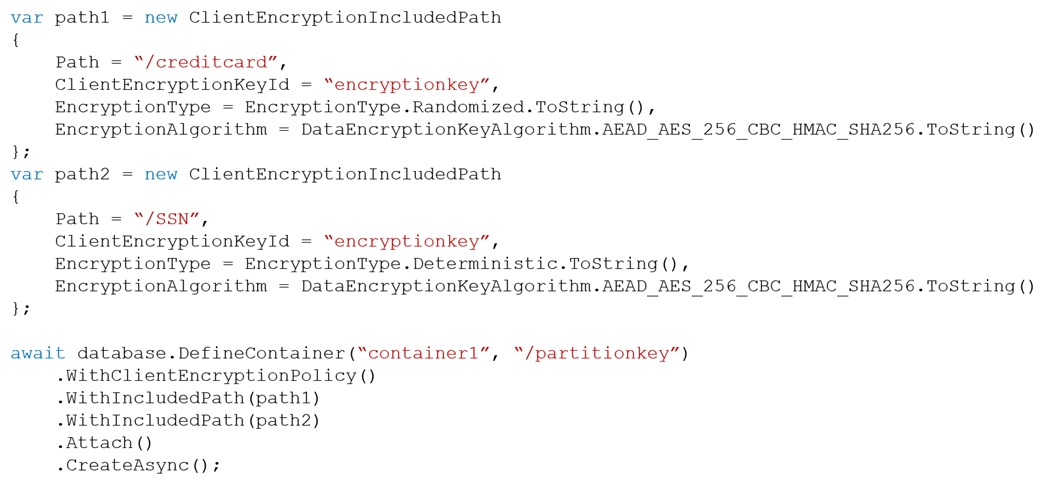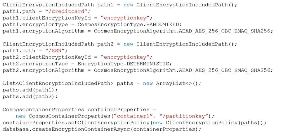 You configure container1 to use Always Encrypted by using an encryption policy as shown in the C# and the Java exhibits. (Click the C# tab to view the encryption policy in C#.