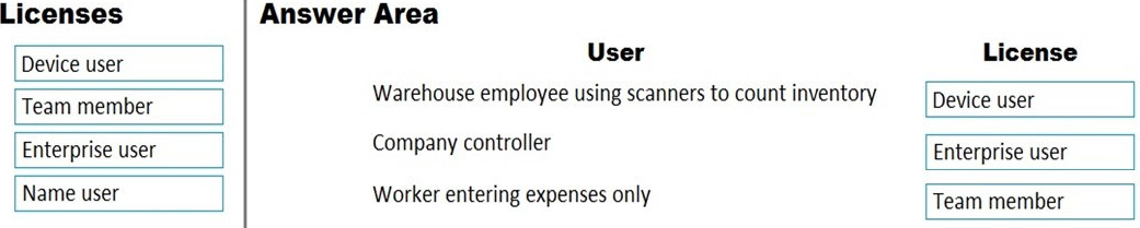 DRAG DROP You need to determine user licensing options for Dynamics 365 Finance + Operations (on-premises).