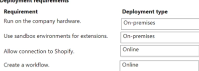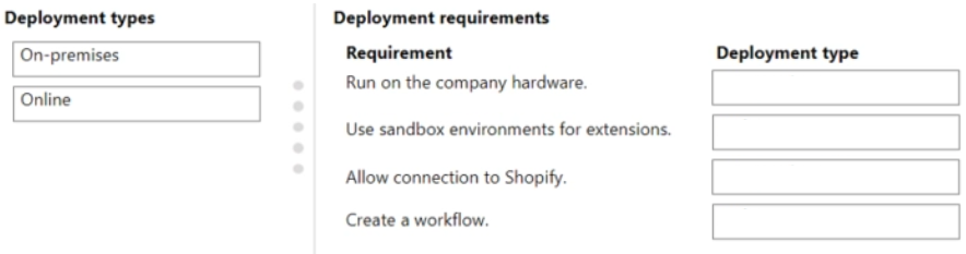 Which deployment types should you use? To answer, move the appropriate deployment types to the correct requirements. You may use each deployment type once, more than once, or not at all. You may need to move the split bar between panes or scroll to view content.