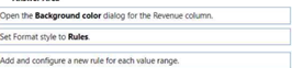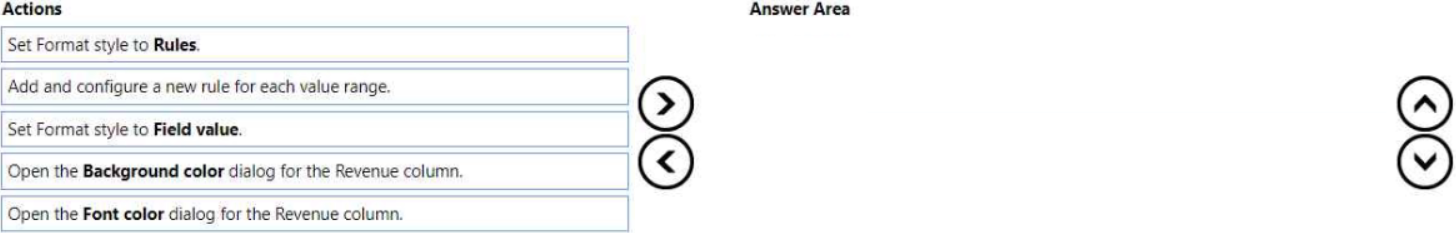 You need to format the visual so that the Revenue column displays a specific background color based on the value range shown in the following table.