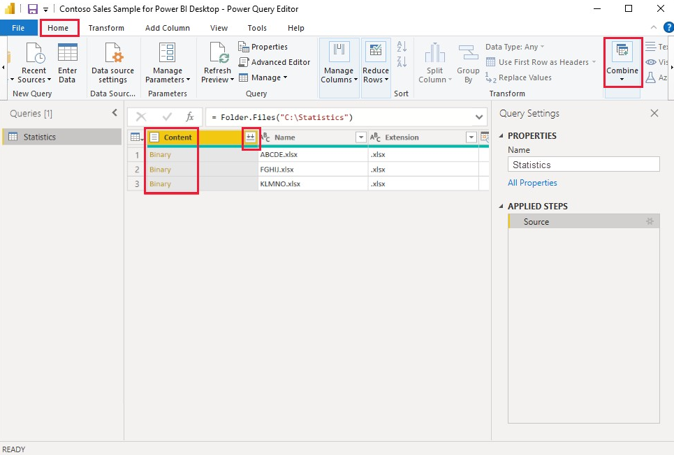 To combine binary files in Power Query Editor, select Content (the first column label) and select Home > Combine Files. Or you can just select the Combine Files icon next to Content.