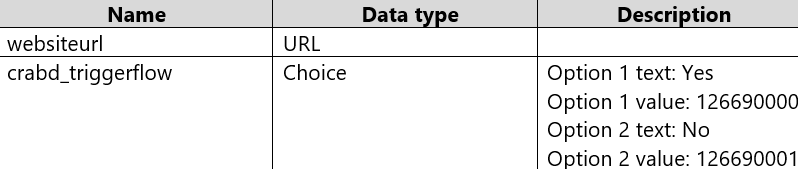 The flow must only trigger when a record is added to the Accounts table and the following conditions are met: the websiteurl field is set to https://microsoft.com the crabd_triggerflow field is set to Yes